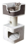 Okrągły szary drapak w łapki z budką, półką i sizalowym słupkiem dla kota